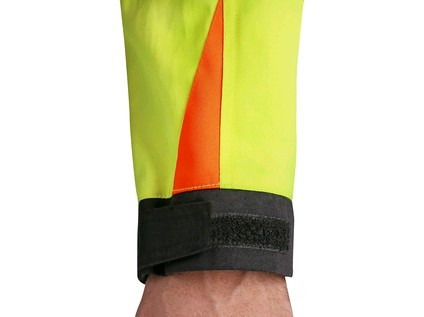 Pánská výstražná blůza, ramena zesílena materiálem CORDURA, rukávy s nastavitelnou manžetou na suchý zip, kryté zapínání na zip, suché zipy a druky, levá náprsní kapsa na zip, pravá krytá klopou, v pravé kapse odnímatelné pouzdro na ID kartu, na levé
