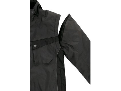 Dámská zateplená bunda 2 v 1, zapínaní na zip krytý légou, odepínací kapuce, fleecový límec, odepínací rukávy, rukávy a dolní okraj bundy ukončeny pružnou manžetou, plastové poutko pod pravou náprsní kapsou, lepené švy, reflexní doplňky. Kapsy: 2 náprsní kapsy, 2 boční kapsy na zip, 1 vnitřní kapsa.