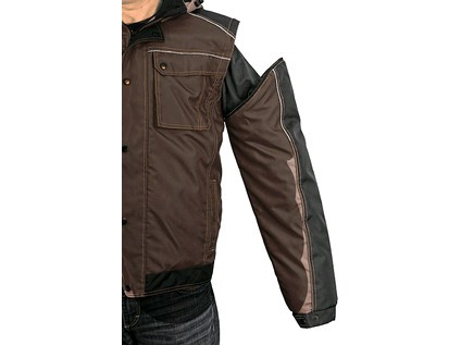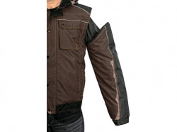 Pánská zateplená bunda 2 v 1, zapínaní na zip krytý légou, odepínací kapuce, fleecový límec, odepínací rukávy, regulovatelné manžety na rukávech, plastové poutko pod pravou náprsní kapsou, stahování v dolním okraji, lepené švy, reflexní doplňky. Kapsy: 4 náprsní kapsy (2 na zip), 2 spodní kapsy na zip, 2 vnitřní kapsy.