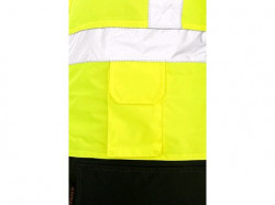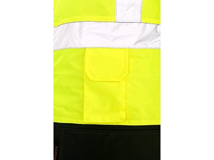 Výstražná bunda s vysokou viditelností, zateplená, odolná proti vodě a větru, kapuce v límci, reflexní pruhy, rukávy a spodní díl zakončeny tmavě modrým materiálem, 4 vnější kapsy a 1 vnitřní kapsa, venkovní kapsa na mobil, možnost utažení v dolní části bundy. Doporučené použití: stavebnictví, silničáři, řidiči, logistika, údržba, popeláři, skladníci, záchranáři, práce v zimě a mokrém prostředí.