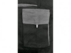 Pánské montérkové kalhoty, pas s poutky na opasek, vzadu do gumy, přední kapsy, boční kapsa na svinovací / skládací metr, boční kapsa na mobil / peněženku, zdvojená kolena, zadní kapsa s klopou, reflexní doplňky.