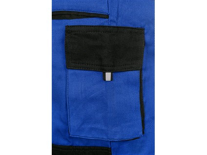 Pánské montérkové kalhoty, pas s poutky na opasek, vzadu do gumy, přední kapsy, boční kapsa na svinovací / skládací metr, boční kapsa na mobil / peněženku, zdvojená kolena, zadní kapsa s klopou, reflexní doplňky.