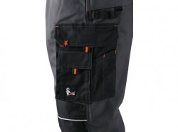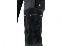Pánské montérkové kalhoty, pas s poutky na opasek a gumou v bocích, přední klínové kapsy, multifunkční kapsy na obou stranách, kolena zesílena materiálem 600D polyesterem s možností vložení kolenních výztuh, dvě zadní kapsy s klopami, spodní část nohavic vyztužena materiálem 600D polyester, reflexní doplňky. Doporučené použití: stavebnictví, strojírenství, lehký průmysl, automobilový průmysl, logistika, skladová manipulace, spedice, autoservisy, údržba, montáže, zemědělství, zahrada, hobby.