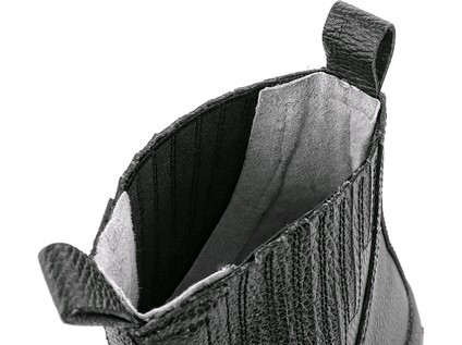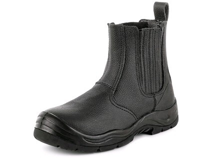 Kotníková obuv s krytou pružinkou, celokožená, materiál: svršek z kvalitní, hrubé tištěné kůže s ocelovou špicí, krytá pružinka z pružné gumy, PU-guma, antistatická, olejivzdorná, protiskluzová podešev, odolná vůči kontaktnímu teplu do 300 °C.