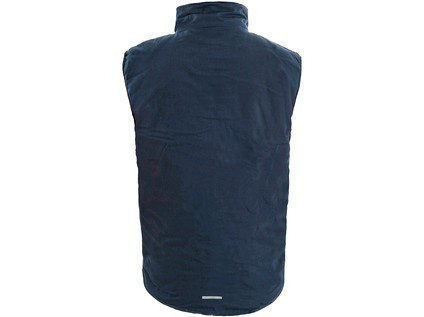 Pánská zateplená vesta s prodlouženým zadním dílem, zapínání na druky, 4 vnejší kapsy s klopou, náprsní kapsa na zip, reflexní doplňky.