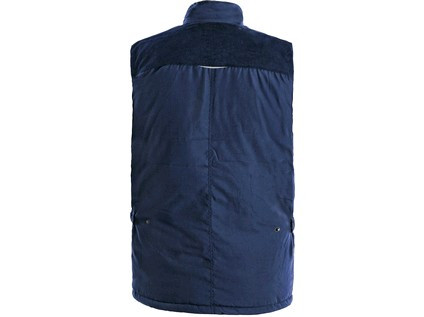 Pánská zateplená vesta, ramena a límec pošitý manšestrem, pružné stažení průramku, zapínání na zip krytý légou, stahování v dolním okraji, 8 vnějších kapes, reflexní doplňky, vnitřní kapsa na zip.
