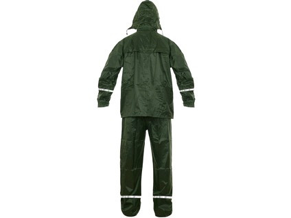 Nepromokavý oděv do deště s kapucí v límci, nižší hmotnost. Zapínání na zip, stahování v dolním okraji, větrání na zádech a v podpaží, kalhoty v pase do gumy, lepené švy. Praktické balení na zip. Reflexní doplňky u modré a zelené varianty.