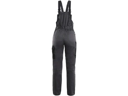 Dámské montérkové kalhoty s náprsenkou, z lehkého materiálu, náprsní kapsa s klopou, přední klínové kapsy, boční kapsa s klopou, kapsa na skládací/svinovací metr, zadní jednoduchá kapsa, šle vzadu na gumu. Díky odlehčené gramáži vhodné pro práci neje